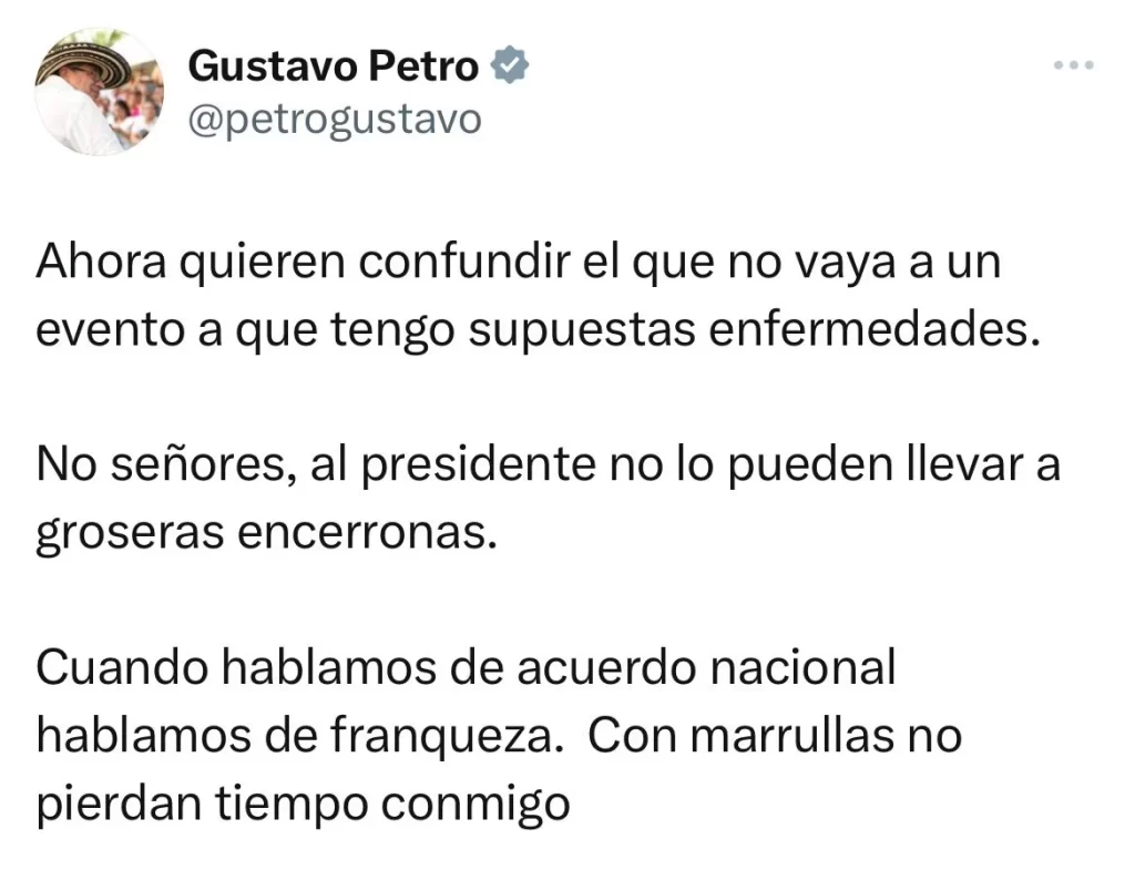 Después de que el viernes pasado no asistiera a los eventos que había programado en Cartagena, uno sobre paz y otro en el congreso anual de la Andi, el jefe de Estado expresó su irritación por las especulaciones en aumento: «Ahora quieren malinterpretar mi ausencia en un evento como una supuesta enfermedad», tuiteó Petro.